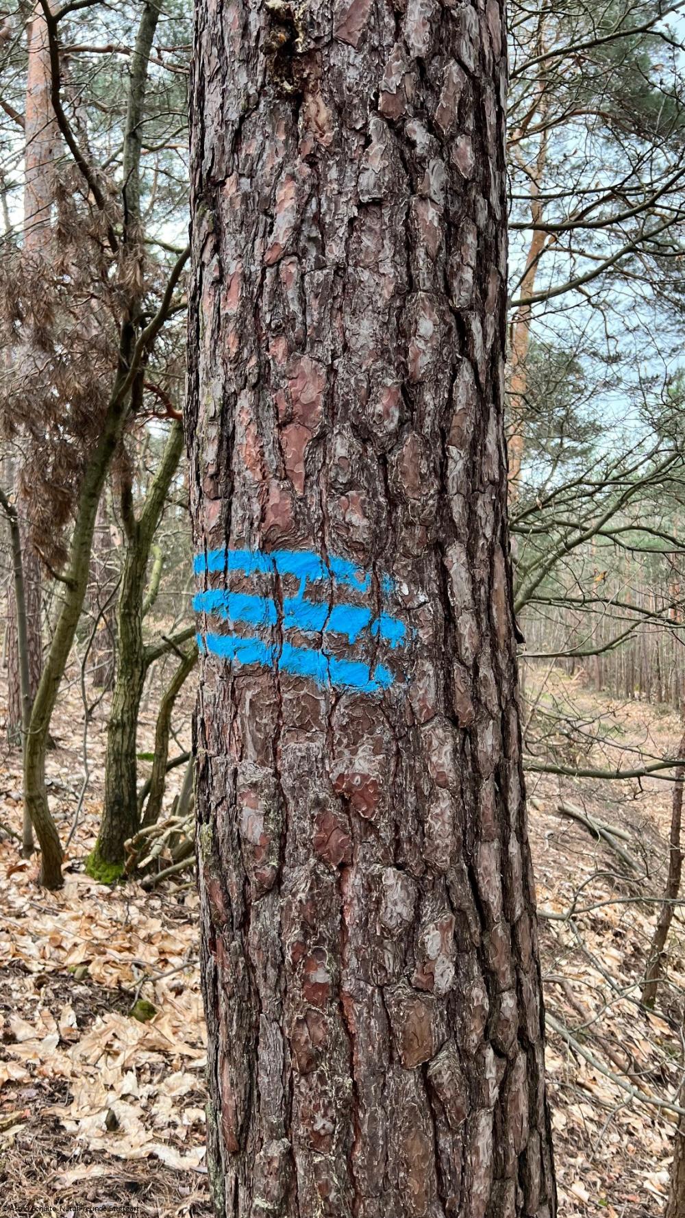 Fällmarkierungen: Bäume, die zur Fällung vorgesehen sind, sind gut zu erkennen an einem farbigen Kreuz oder Punkt (rot, blau, orange). Da wird einem manchmal das Herz schwer. Die sogenannten Zielbäume bleiben langfristig im Bestand, weil sie besonders wertvoll oder stabil sind. Um sie zu fördern, werden Baum-Konkurrenten entnommen. Das Entfernen einzelner Bäume ist Teil der nachhaltigen Waldpflege. So soll Licht, Raum und strukturelle Vielfalt im Bestand entstehen.