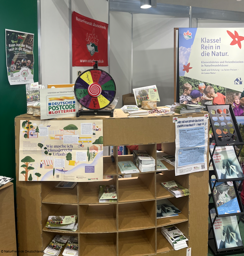 Eine erste Maßnahme des Projektes konnte bereits erfolgreich abgeschlossen werden. So wurden auf der Bildungsmesse Didacta 2024 in Köln potenzielle Hausgäste wie Lehrkräfte durch Diskussionen, Workshops zu nachhaltigen Klassenfahrten und durch die Verteilung des NaturFreunde-Plakates "Wie mache ich klimagerecht Urlaub?" für das Thema sensibilisiert. Das Plakat und weitere Materialien werden zusätzlich in Naturfreundehäusern im Eingangsbereich platziert, um noch mehr Gäste anzusprechen und mit ihnen über das Thema ins Gespräch zu kommen. In diesem Zusammenhang soll auch ein Flyer entstehen, der das Thema "Reisen? Naturfreundlich! Klimafreundlich!" in Naturfreundehäusern adressiert. Das im kommenden August neu aufgelegte Verzeichnis der Naturfreundehäuser in Deutschland wird das Thema ebenfalls aufgreifen.