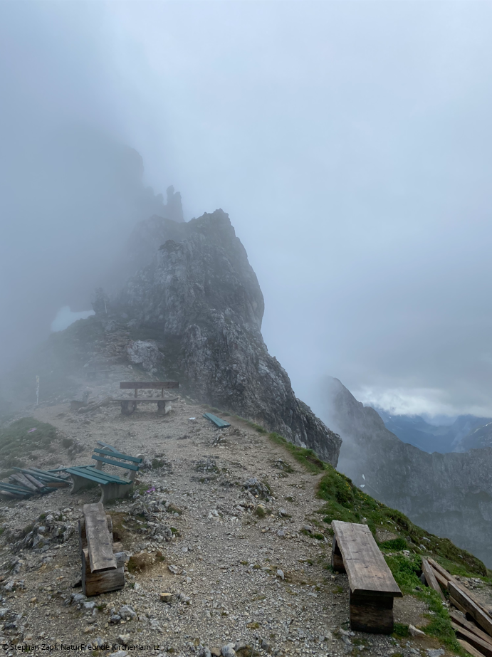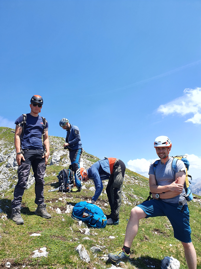 Das Wetter für den nächsten Tag sah nicht gut aus. Tiefe Wolken, hohe Regenwahrscheinlichkeit – nicht das beste Wetter für eine derartige Tour am Grat. Trotzdem starteten wir zur Karwendelbahn, um uns dort mit Tim, dem zweiten Ausbilder, zu treffen. Gleich mit der ersten Bahn ging es hinauf. Am Einstieg zum Klettersteig hingen noch tiefe Wolken, die sich dann schnell auflösten und uns einen perfekten Tag bescherten. Der Abend war geprägt von Theorie und Vorbereitung auf die am Mittwoch geplanten Lehrproben. Bau von Seilgeländern zwischen den Türgriffen in der Pension, Vorbereitung zur behelfsmäßigen Bergrettung und Erarbeitung des Schulungsablaufs.