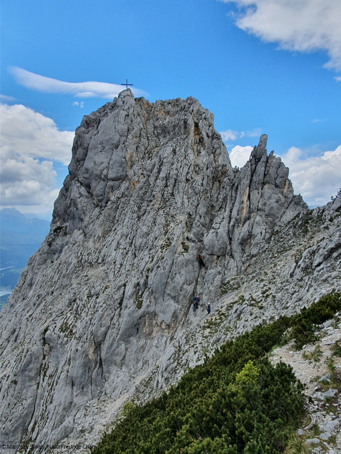 Am Freitag stand die Abschlusstour auf dem Programm: Der Südwestgrat der Viererspitze. 4 Seillängen im 3. Schwierigkeitsgrat mit der Schlüsselstelle 4+ direkt am Einstieg der Route. Start war wieder der Wanderparkplatz am Dammkar. Von dort ging es auf dem Wanderweg bis kurz unter die Mittenwalder Hütte. Dort zweigt der Weg links ins weglose Gelände ab. Wir suchten uns den Weg um die letzten Schneefelder bis in die Kreuzklamm. Dieser folgten wir bis zum Einstieg in den Südwestgrat. Die Einteilung der Seilschaften erfolgte schon am Vorabend, sodass wir schnell in der Route waren. Am Gipfel gab es dann eine kurze Brotzeit bevor wir den Abstieg zur Dammkarhütte nahmen. Nach der kräftezehrenden Tour kehrten wir noch beim nahe gelegenen Italiener ein und konnten den Abend mit dem Abschlussgespräch beenden.