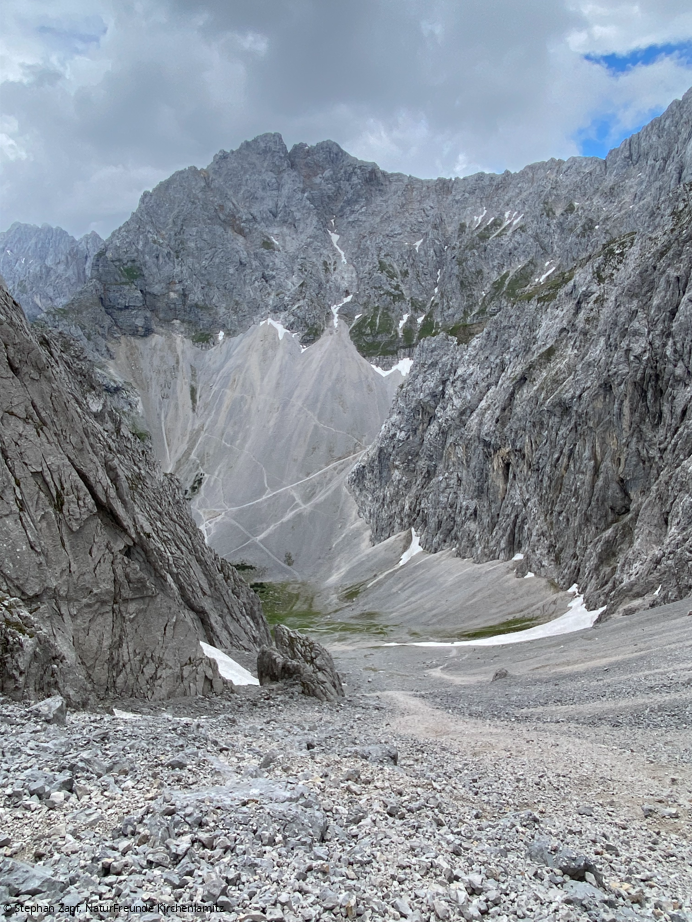 Der Soldatenweg war unser Ziel. Pünktlich starteten wir am Wanderparkplatz Richtung Dammkarhütte. Kaum gestartet setzte auch schon starker Regen ein. Dank guter Tourenplanung waren wir entsprechend vorbereitet und konnten mit Regenkleidung die Tour fortführen. Doch am Einstieg zur Route war klar, bei dem Wetter ist an Klettern nicht zu denken. Auch das ist Teil der Ausbildung – Risikoeinschätzung und auch mal „abzubrechen“. So nutzten wir das Gebiet um die Dammkarhütte, um das Gehen in weglosen Gelände sowie das Abfahren im Geröll zu üben. Den Nachmittag verbrachten wir noch im Klettergarten Sonnenplatten, wo wir einige Mehrseillängen klettern konnte.