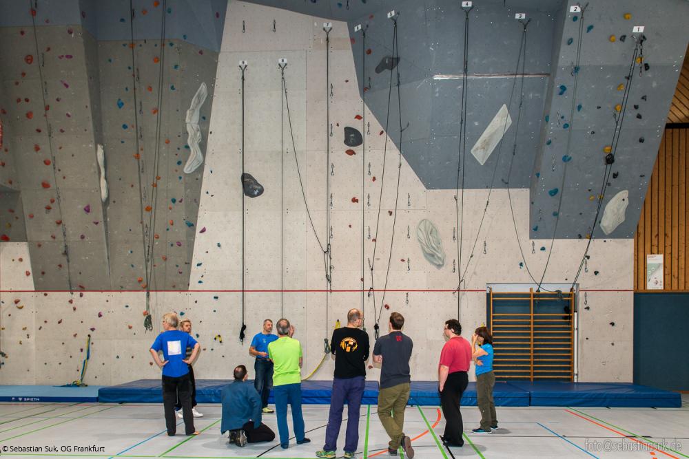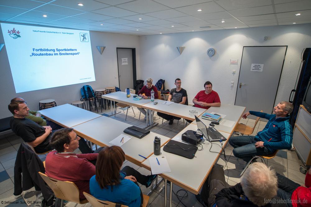 Lange haben wir auf den Routenbaulehrgang gewartet. Klaus Rübensal vom Lehrteam der NaturFreunde vermittelte uns in lockerer Runde die notwendigen theoretischen Grundlagen.