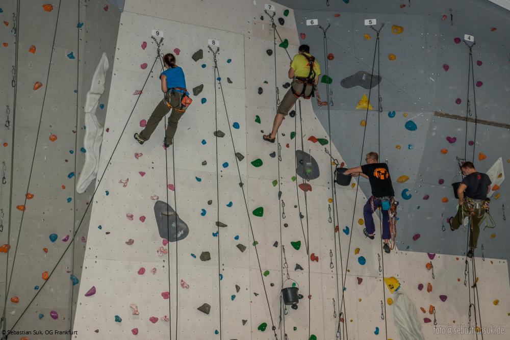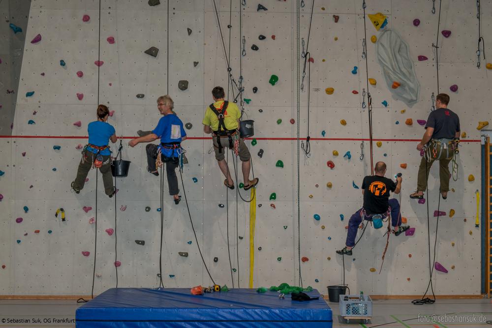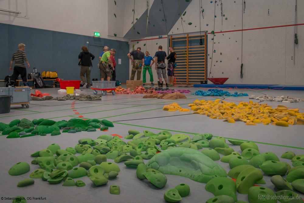 Und am Samstagmorgen ging es dann endlich an die Wand im Sportverein Fun-Ball Dortelweil e.V.. Mit viel Fantasie und Kreativität entstanden die ersten neuen Kletterrouten. Und so immer weiter bis zum Sonntagnachmittag. Müde, aber glücklich haben wir dann die Kletterwand verlassen. Auf die Kletterer warten jetzt 33 neue Routen von 4- bis 8+.